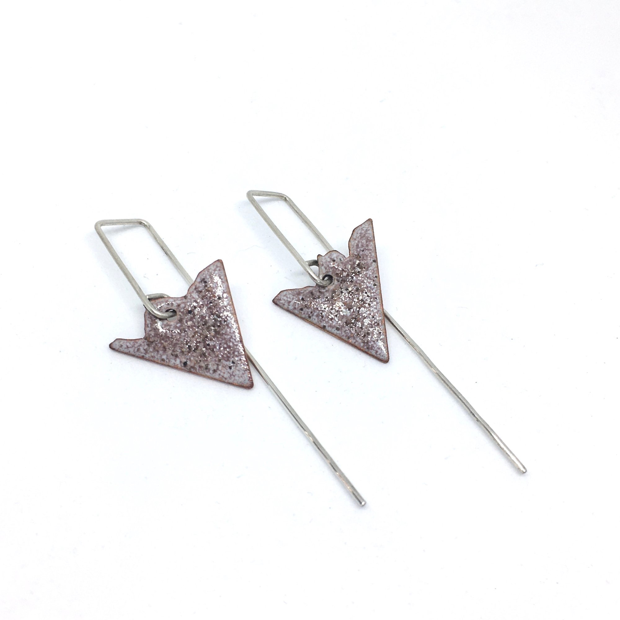 Enamelled copper with sand texture surface on long silver hooks. 5cm long