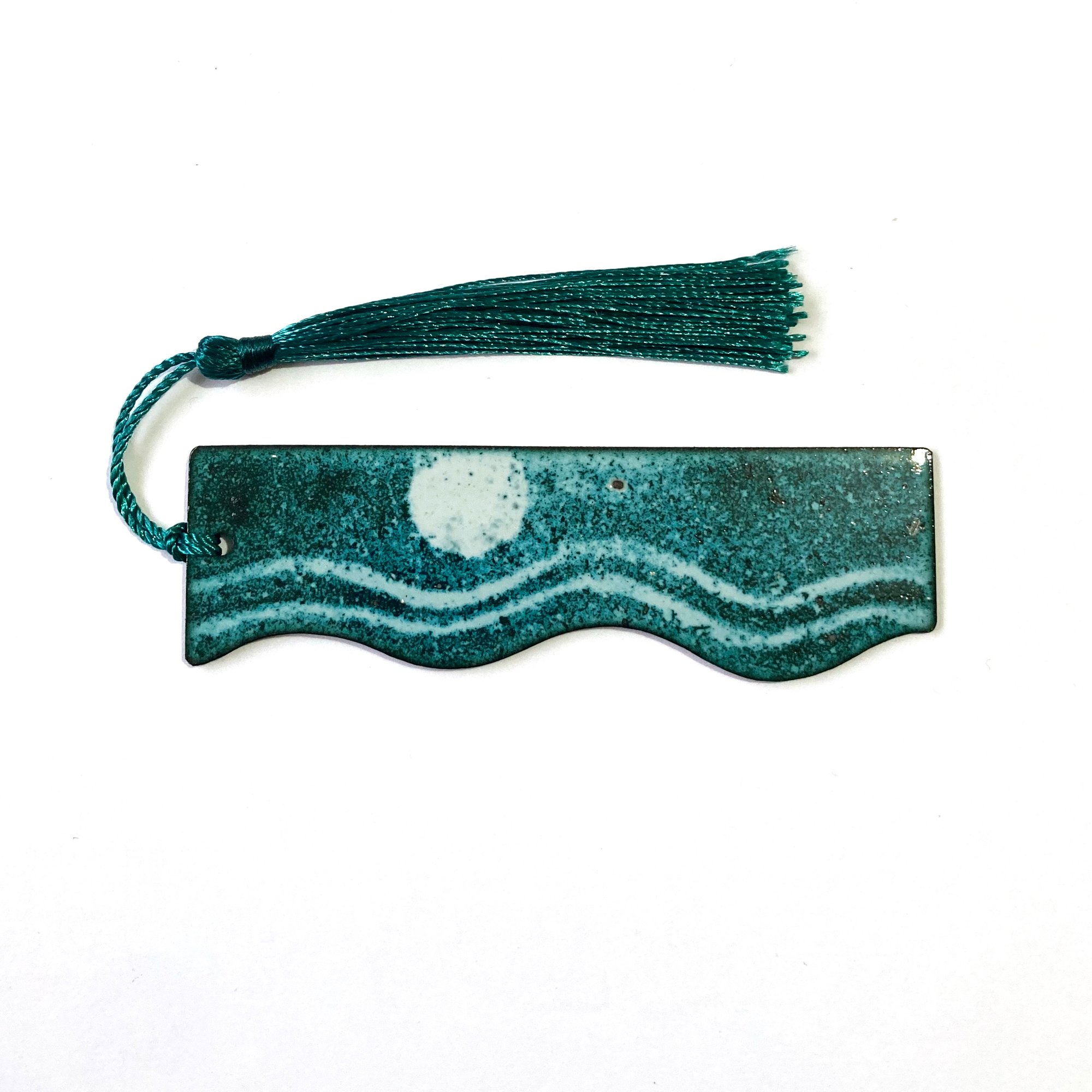 Enamelled Copper Bookmark with sunset seascape design and deep red tassel. 10cm long.