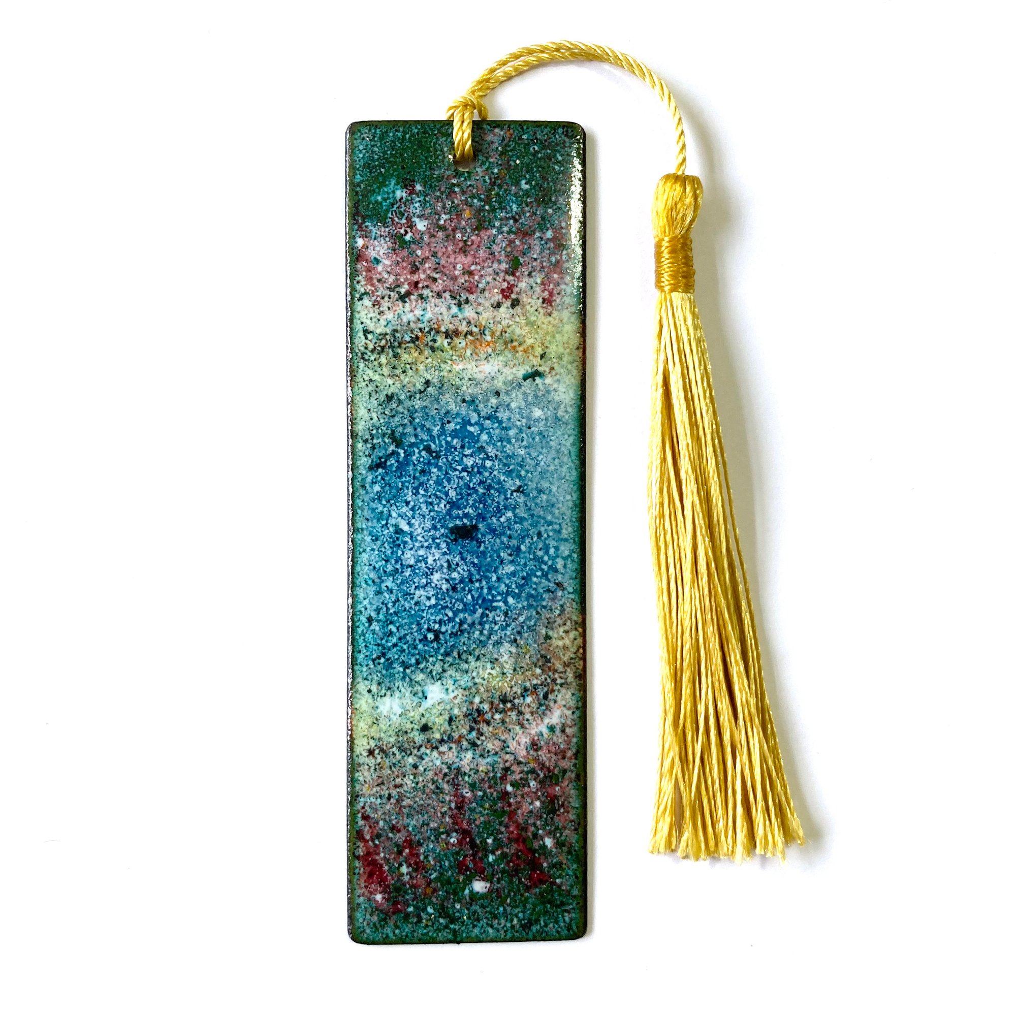 Enamelled Copper Bookmark with yellow tassel. Inspired by the Ring Nebula. 10cm long.