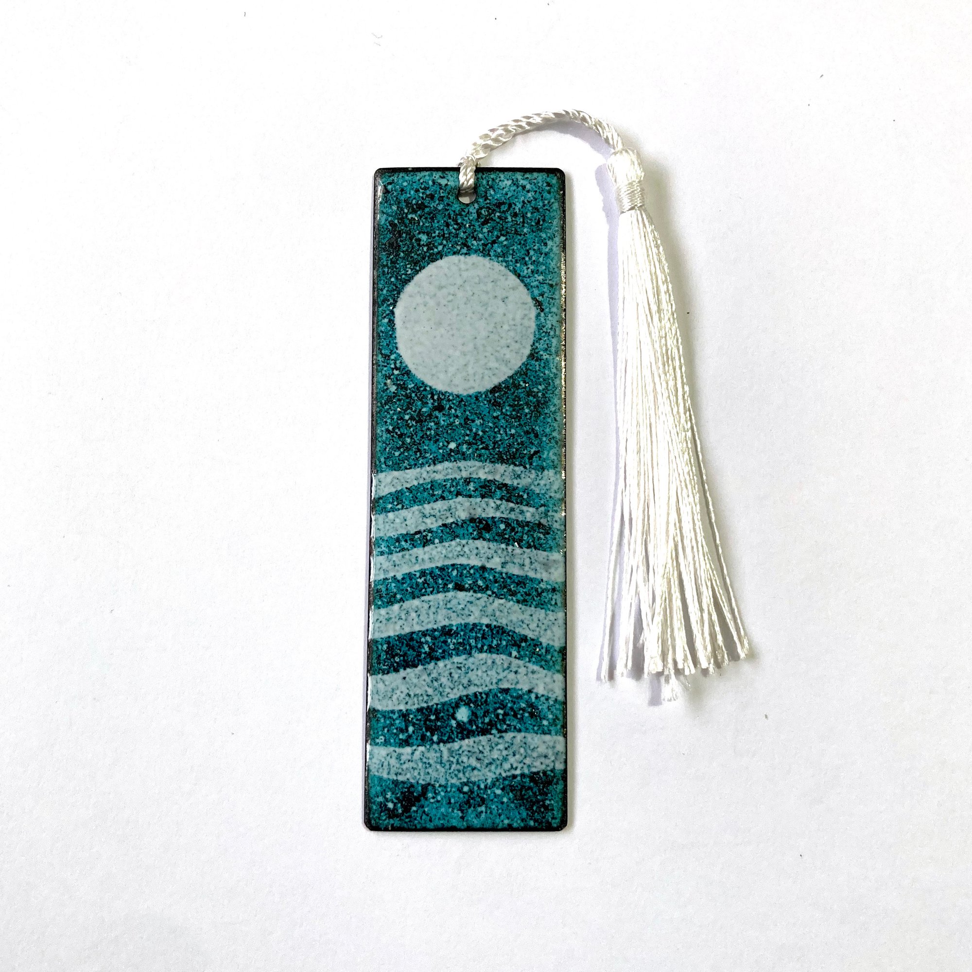 Enamelled Copper Bookmarks with moonlit seascape design and silver tassel.