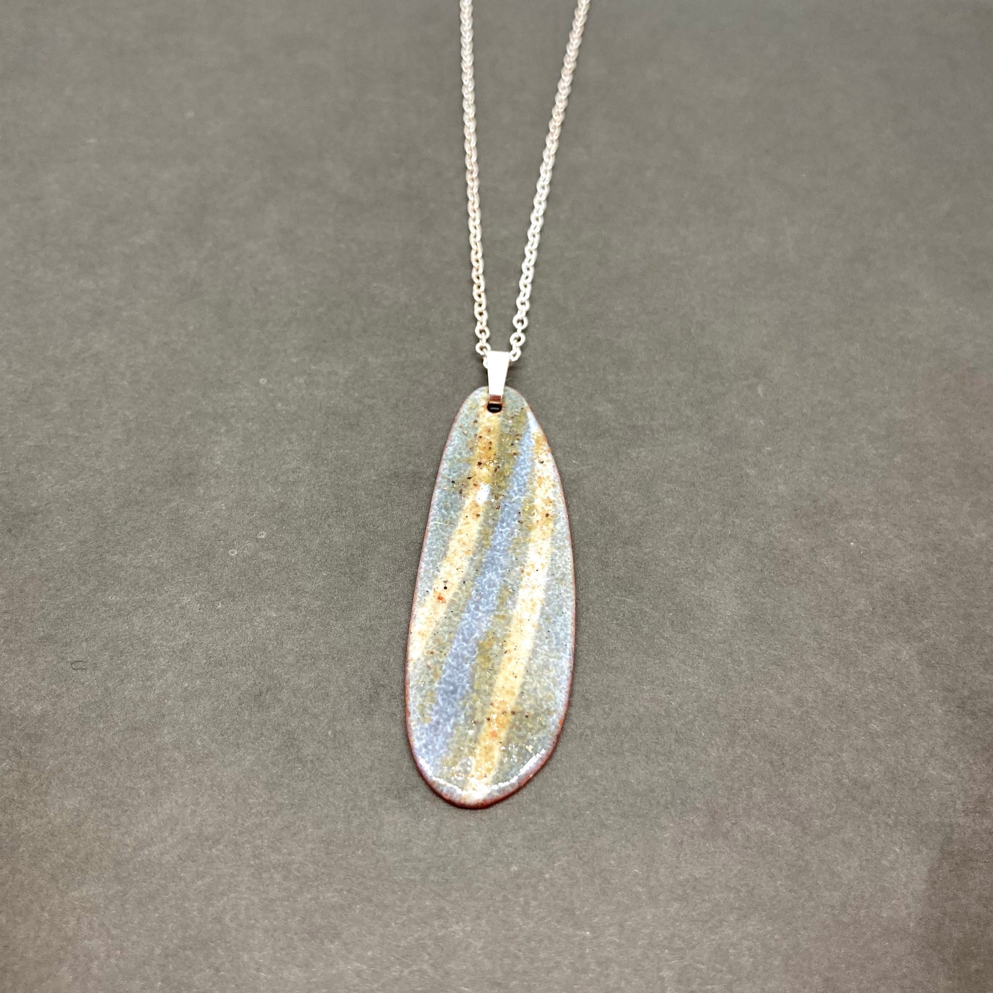 Grey and amber striped flat pendant with sand texture. 5cm long on 18" silver chain.