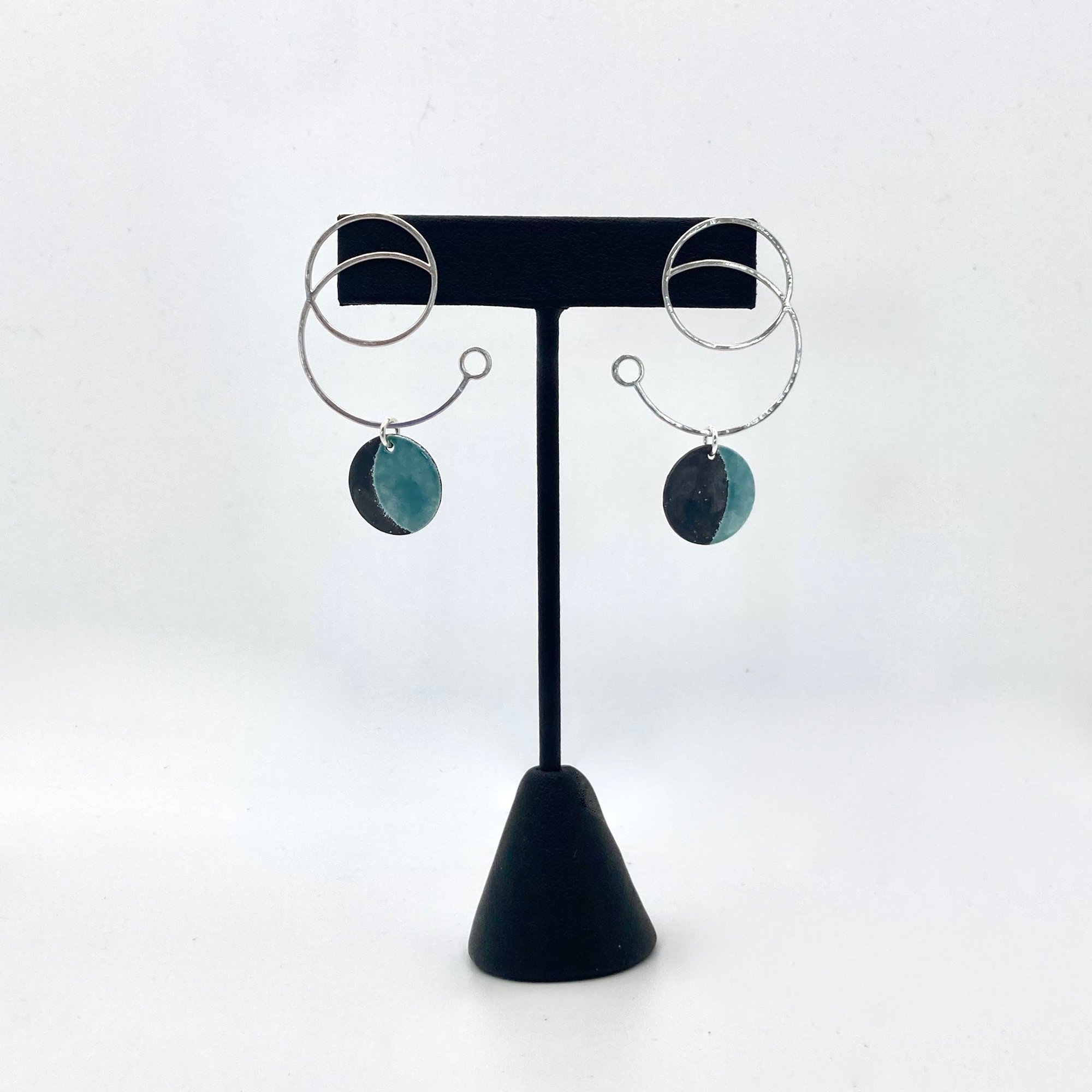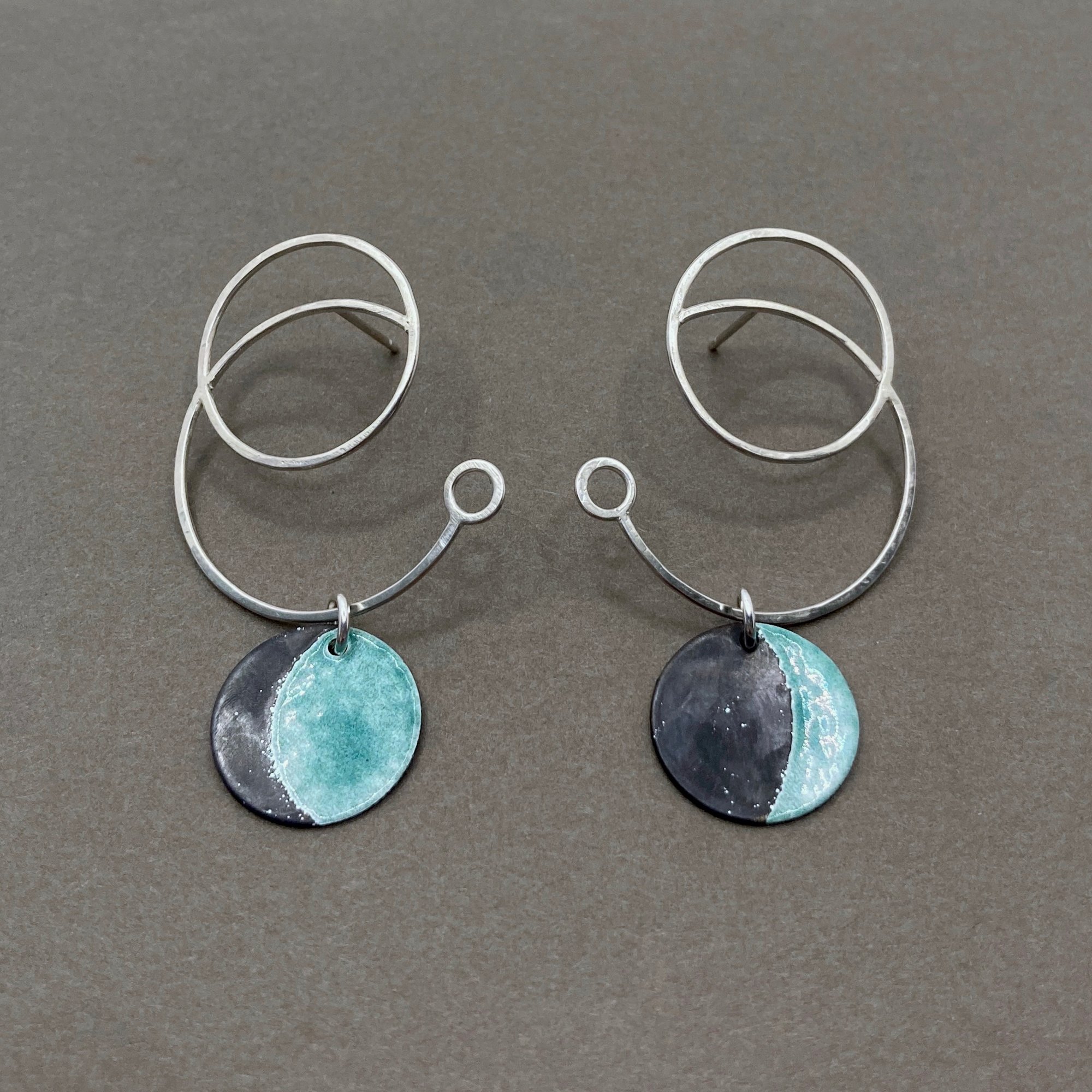 Enamelled Silver Moons on Silver wirework Stud Earrings with butterfly backs.