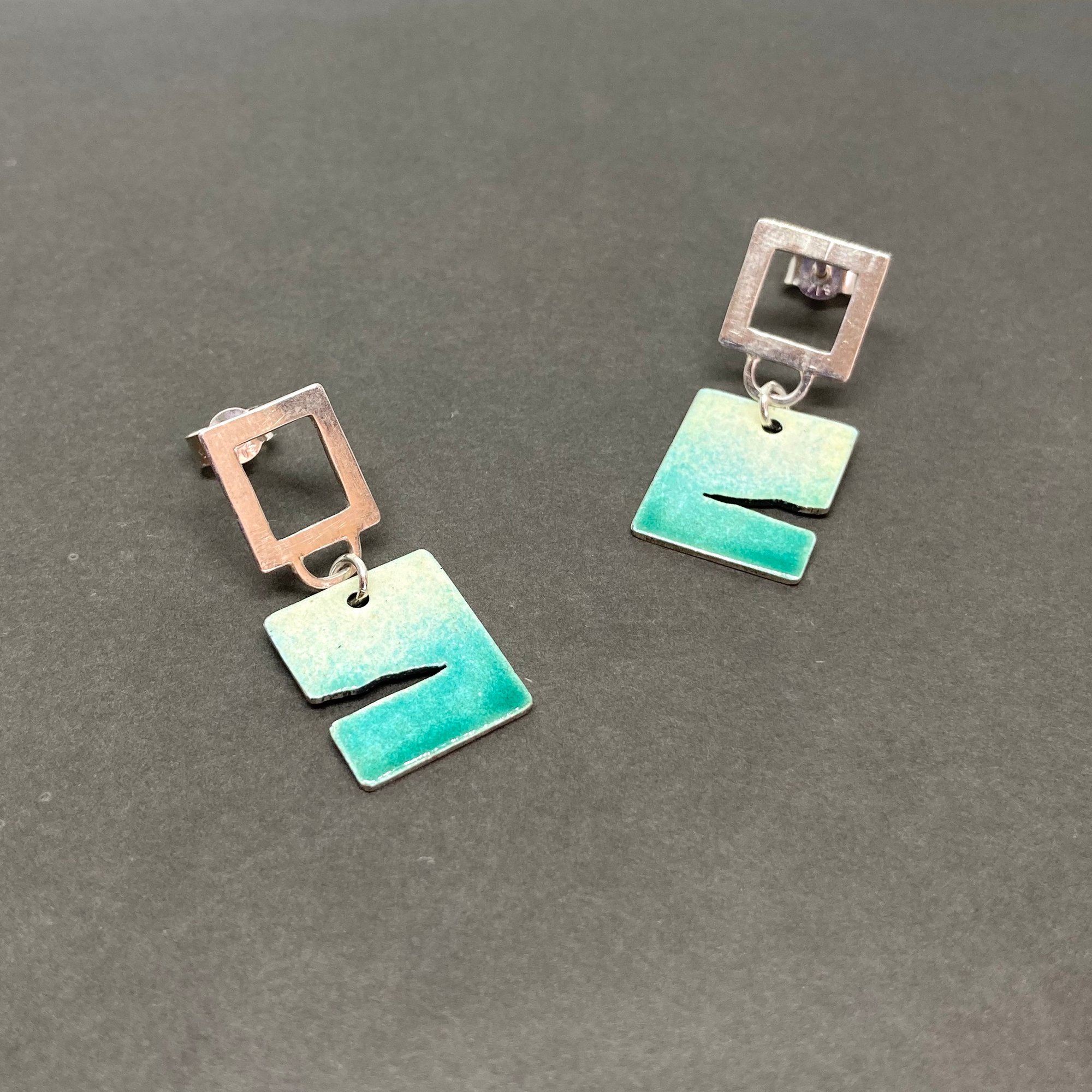 Enamelled Silver Square Seascapes hanging on Silver Square Studs.