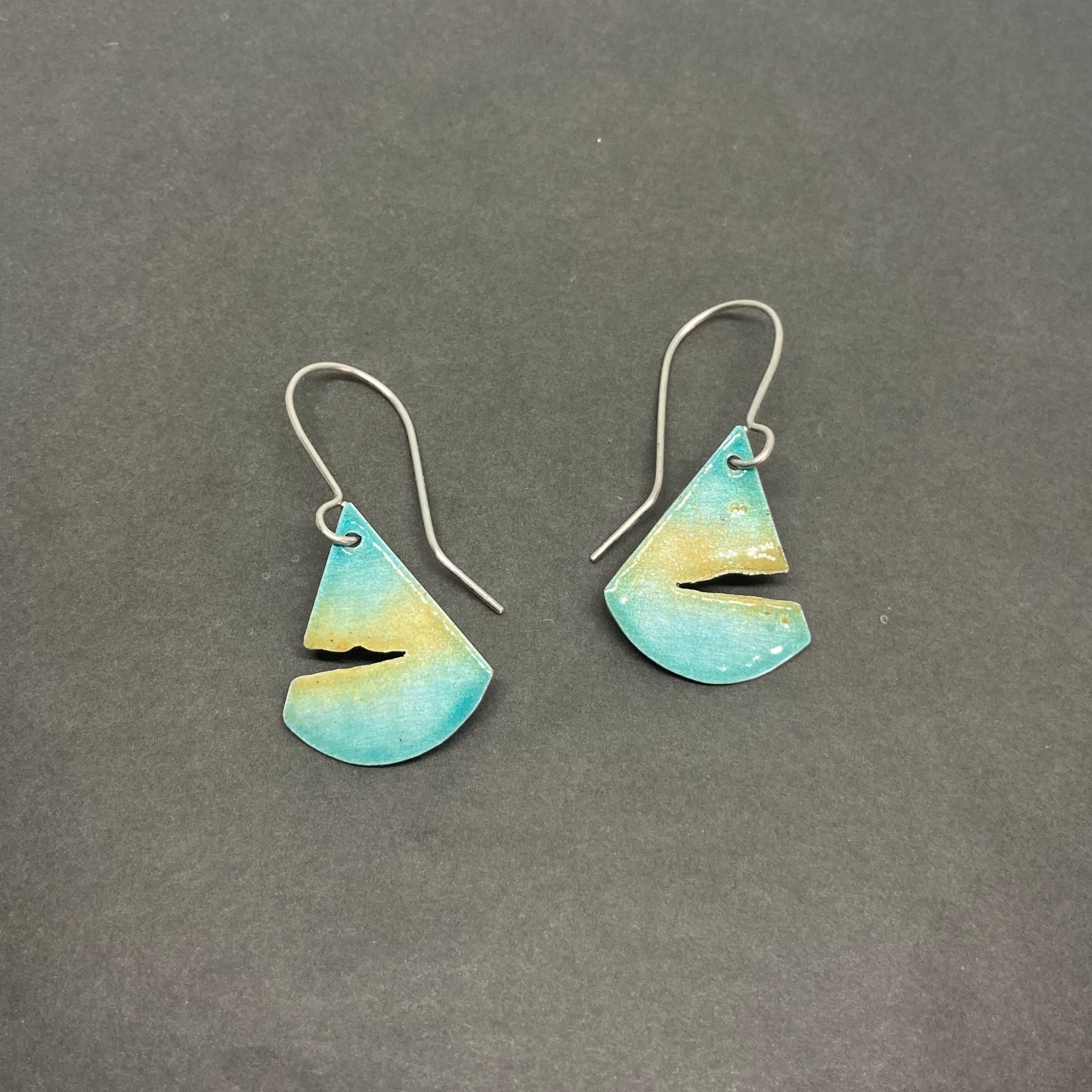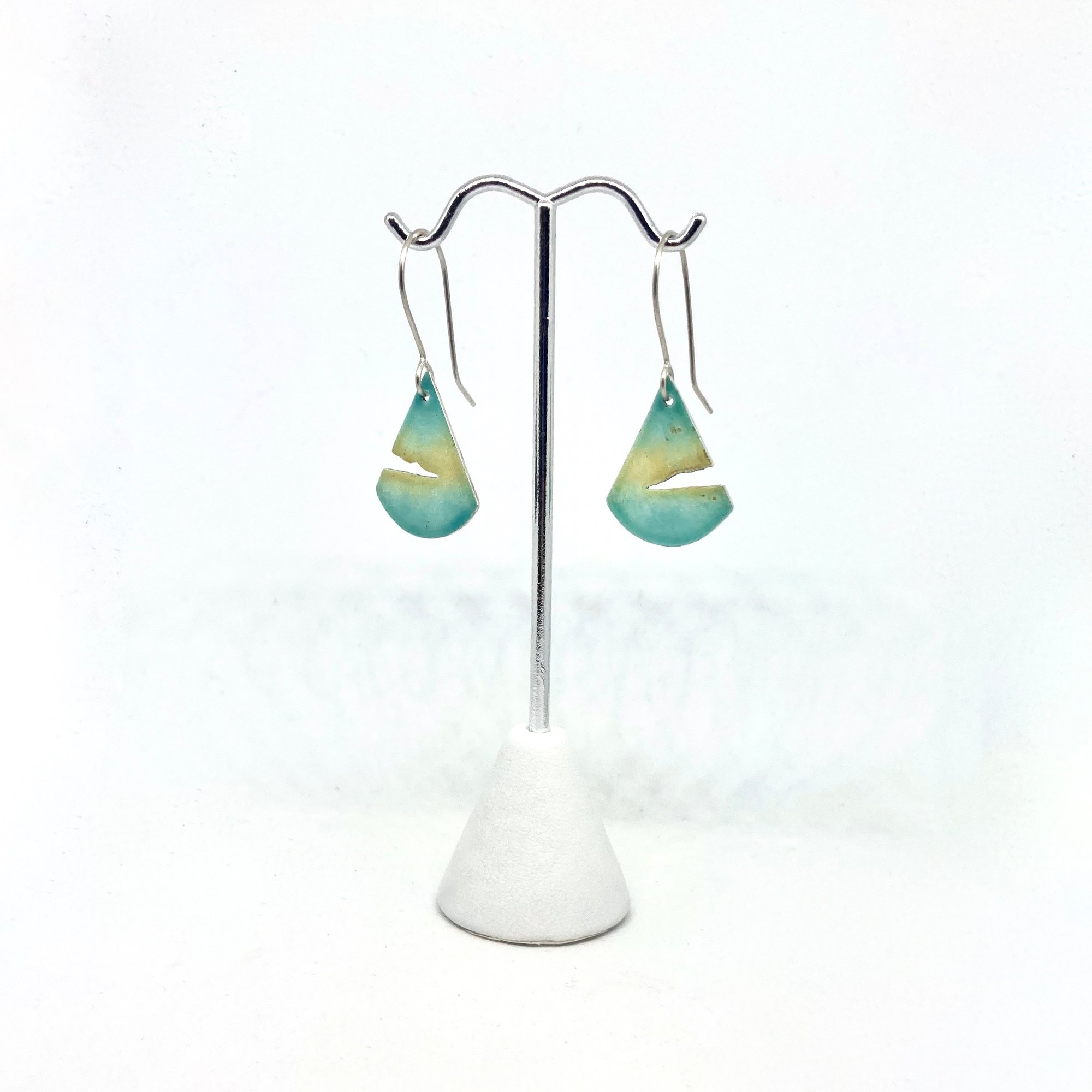 Enamelled Silver fan-shapes, with cut-out islands shapes, hanging on silver hooks.