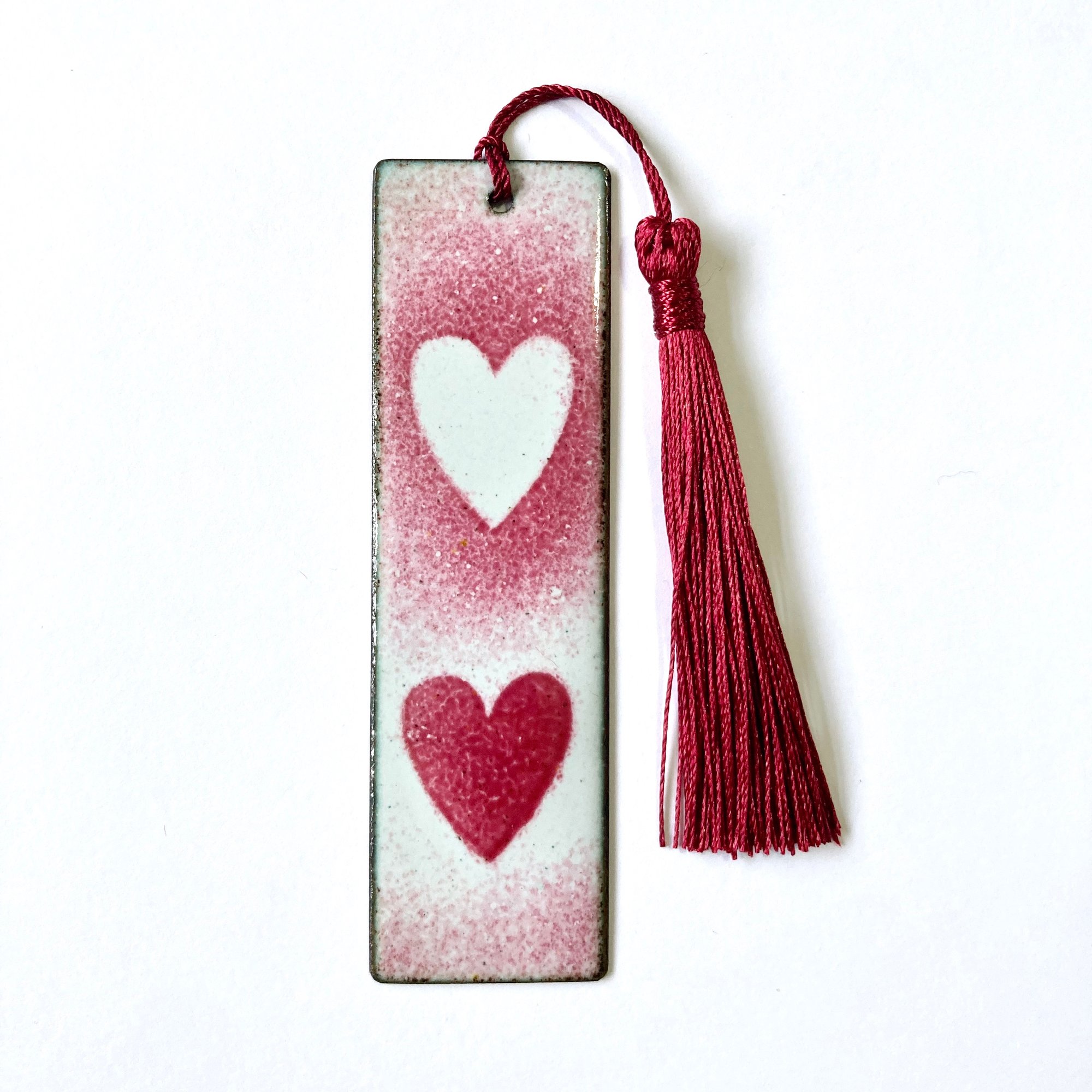 Enamelled copper bookmark with red hearts design and red tassel.